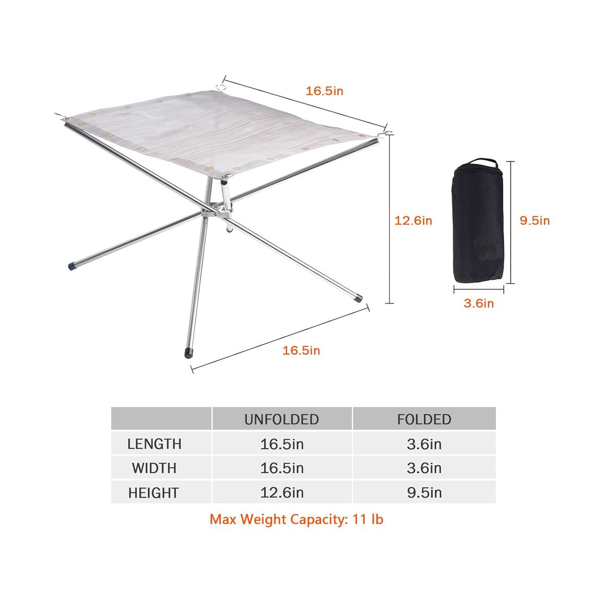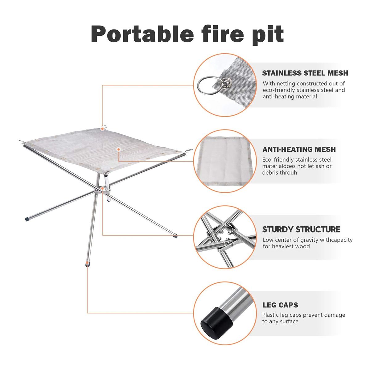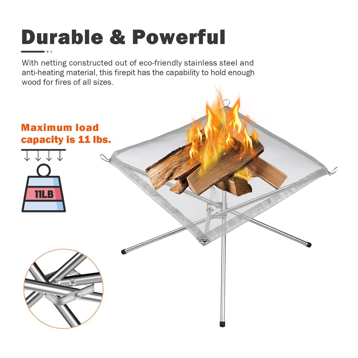 Made of Heat-resistant mesh and the legs are made of 304 stainless steel material. Durable and sturdy. Size is 16.5"L x 16.5"W x 12.6"H and weighs 1.5 lbs. Folded up, it is 9.5"L x 3.6"W x 3.6"H. Maximum load capacity is 11 lbs. Easily and conveniently store it in your car, closet, shed. It's very easy to carry when you want to go for outdoor camping or BBQ. Best choice for outdoor wood burning such as camping, outdoors picnic, beach, garden, trekking, barbecue, fishing, climbing, etc.